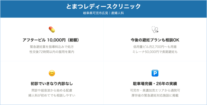 | とまつレディースクリニック | 可児市広見(可児/新可児駅エリア) | 緊急避妊薬(レボノルゲストレル系) | 10,000円(税込)|緊急避妊(指導料含む)と明記 | 産婦人科。避妊ページにアフターピル・低用量ピル・ミレーナの料金を一覧で掲載。支払いは現金のみ。 |