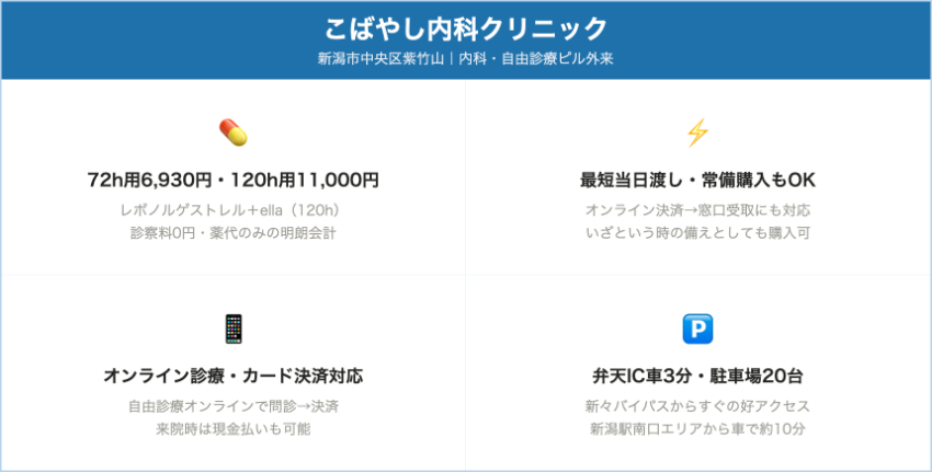 | こばやし内科クリニック | 新潟市中央区紫竹山 / 新々バイパス弁天IC近く | レボノルゲストレル1.5mg(72時間用) / ella(ウリプリスタル酢酸エステル・120時間用) | レボノルゲストレル:7,700円 / ella:1錠 11,000円(2個 19,800円 / 3個 28,050円もあり) | 内科ですが自由診療でアフターピルに特化した案内ページを用意。診察料0円で、オンライン決済+最短当日渡しが可能です。72時間用と120時間用の両方を扱う点も特徴です。 |