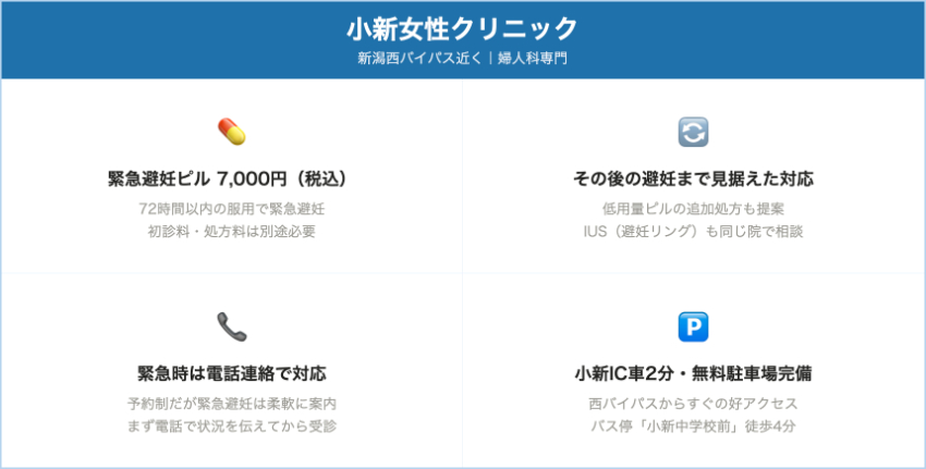 | 小新女性クリニック | 新潟市西区小新南 / 小新IC近く(車向き) | 72時間用アフターピル(詳細成分名は記載なし) | 7,000円(モーニングアフターピル) | 婦人科専門クリニック。避妊診療として低用量ピル・IUSと並んで緊急避妊ピルの料金を明示。未成年は親権者同意が必要で、車通院しやすい西区エリアです。 |