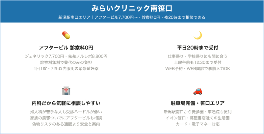 | みらいクリニック南笹口 | 新潟市中央区南笹口 / 新潟駅南口エリア | ノルレボ(先発)1.5mg / レボノルゲストレル(後発)1.5mg(ともに72時間用) | ノルレボ:8,800円 / レボノルゲストレル:7,700円(診察料0円で薬代のみ) | 内科・小児科の自由診療としてアフターピルを提供。性行為後72時間以内の服用と、24時間以内の内服がより効果的であることを説明しており、平日20時まで受付で仕事帰りにも利用しやすいです。 |