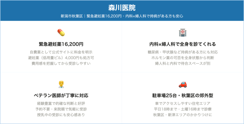 | 森川医院 | 新潟市秋葉区程島 / 新津エリア(車通院向き) | 緊急避妊薬(モーニングアフターピル:薬剤名の記載なし) | 緊急避妊薬:16,200円(自費薬として掲示) | 糖尿病・内分泌内科+婦人科を標榜するクリニック。婦人科待合が内科と分かれており、持病がある人も全身状態を相談しながら緊急避妊を検討しやすい環境です。 |