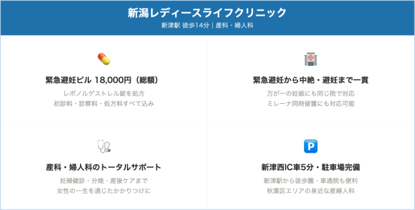 | 新潟レディースライフクリニック | 新潟市秋葉区新津 / 新津駅周辺 | 72時間用アフターピル / 120時間用アフターピル | 72時間用:18,900円 / 120時間用:16,500円(院内処方・診察料込の目安) | 産科・婦人科クリニック。緊急避妊ピルだけでなく人工妊娠中絶やミレーナ挿入まで同院で完結できる体制が特徴です。 |