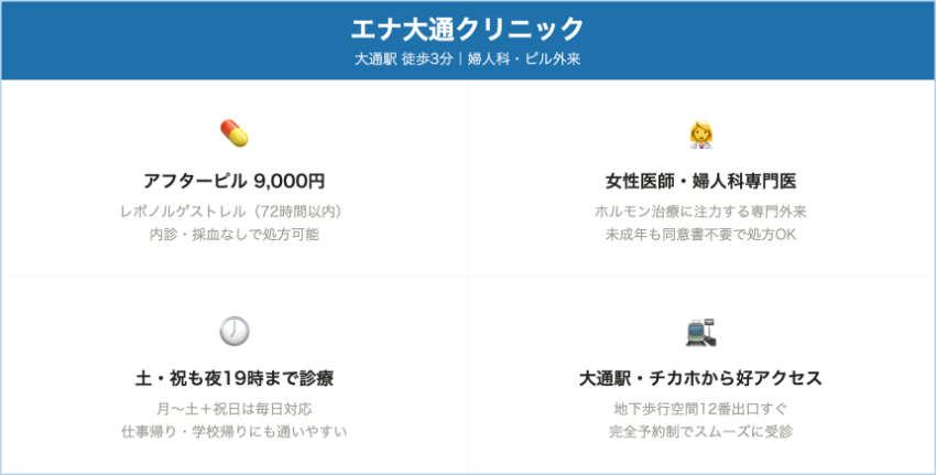 札幌中心部で仕事や学校がある人や、大通駅・チカホ沿いでアフターピルを検討したい人には、エナ大通クリニックは特におすすめです。