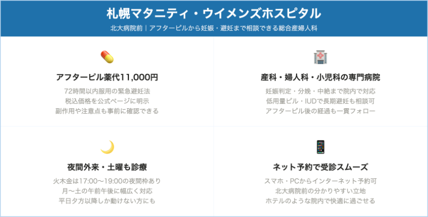 札幌駅・大通・円山・白石など、札幌市内でアフターピル(緊急避妊薬)の処方を受けられる主なクリニックについて、72時間以内用・120時間以内用の有無や料金、診療時間の目安を一覧表にまとめました。