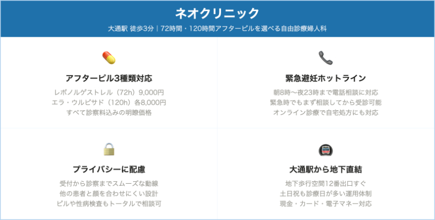 ネオクリニック|大通駅徒歩3分、72時間・120時間アフターピルを選べる自由診療婦人科