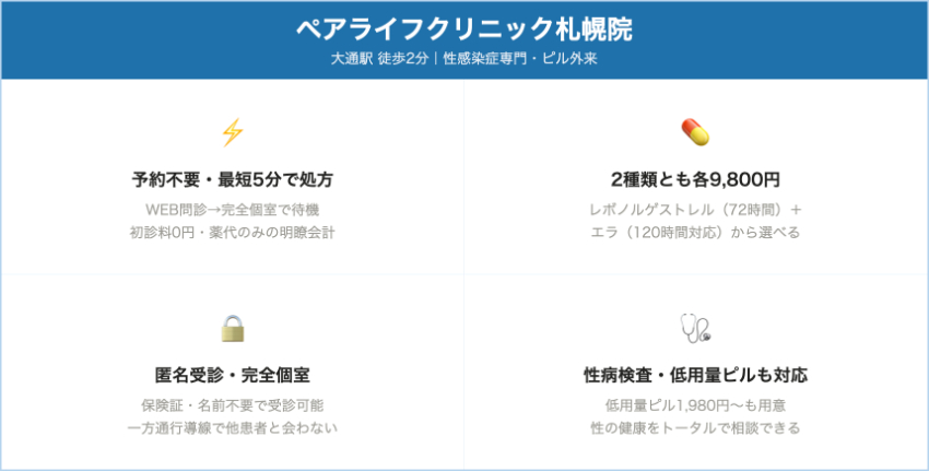 ペアライフクリニック札幌院中央区・大通駅徒歩2分レボノルゲストレル錠 1回 9,800円(診察料・相談料込み)エラ(ウリプリスタル錠)1回 9,800円(診察料等込み)性感染症専門。匿名・保険証不要、予約不要で最短5分処方。平日土日祝10:00〜19:00。