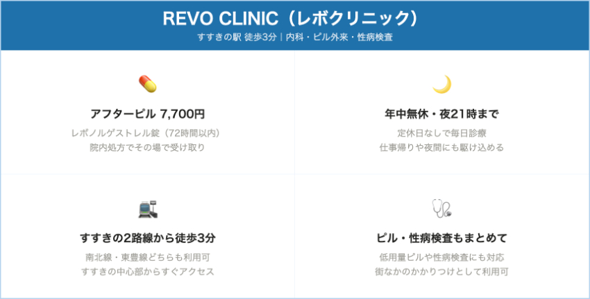 REVO CLINIC中央区・すすきの駅/豊水すすきの駅徒歩約3分レボノルゲストレル錠1.5mg 1回 7,700円取扱い記載なし12:00〜16:00/17:00〜21:00、年中無休。内科+ピル・性病診療の自費クリニック。