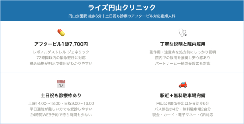 ライズ円山クリニックは、円山公園駅やバス停から近い場所でアフターピルを処方してほしい人、特に札幌市中央区や円山エリアに住んでいる人にとって通いやすい選択肢といえます。