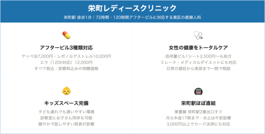 栄町レディースクリニック東区・栄町駅徒歩約1分緊急避妊ピル ヤッペ法 7,000円/レボノルゲストレル 10,000円(いずれも診察料込み)緊急避妊ピル エラ(エラワン)12,000円(診察料込み)月火木金9:00〜17:00、水土9:00〜12:00、日祝休診。東区の駅前産婦人科。
