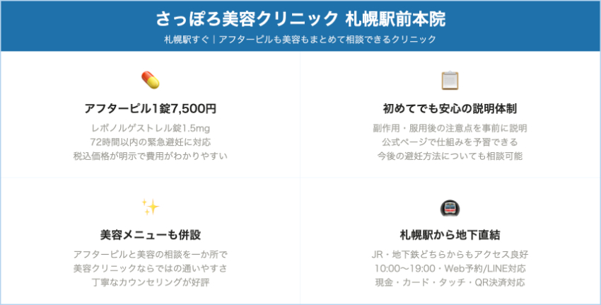 さっぽろ美容クリニック 札幌駅前本院中央区・札幌駅すぐ(札幌TRビル9F)アフターピル(レボノルゲストレル錠1.5mg)1錠 7,500円記載なし(LNGのみ)10:00〜19:00・不定休。美容クリニック本院で標準的なLNG-ECを提供。