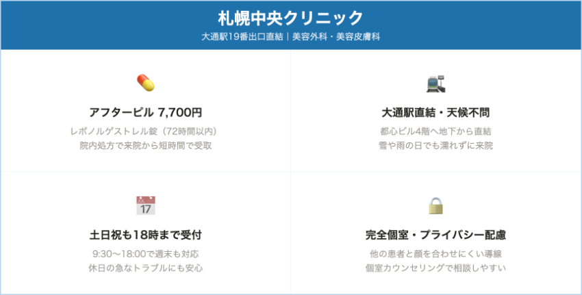 札幌中央クリニック中央区・大通駅19番出口直結レボノルゲストレル錠 1錠 7,700円取扱い記載なし受付9:30〜18:00、土日祝も診療。美容外科内メニューとして提供。