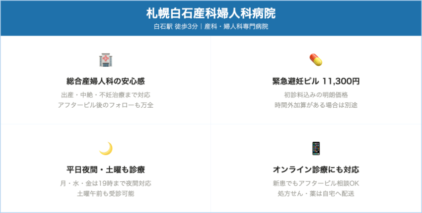 札幌白石産科婦人科病院白石区・白石駅徒歩約3分緊急避妊ピル 11,300円(初診料込み、成分名の記載なし)記載なし平日9:00〜、月水金は夜間診療あり・土曜午前も診療。オンライン診療での相談にも対応。