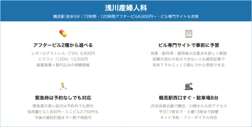 浅川産婦人科鶴見区 豊岡町/鶴見駅西口徒歩3分レボノルゲストレル(72時間)/エラワン(120時間)レボノルゲストレル:6,600円/1回/エラワン:13,200円/1回(服薬指導+薬代込み)