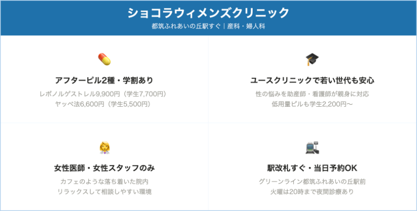 ショコラウィメンズクリニック都筑区 葛が谷/都筑ふれあいの丘駅すぐレボノルゲストレル(72時間)/プラノバール(ヤッペ法)レボノルゲストレル錠:9,900円(学生7,700円)/プラノバール4錠:6,600円(学生5,500円)