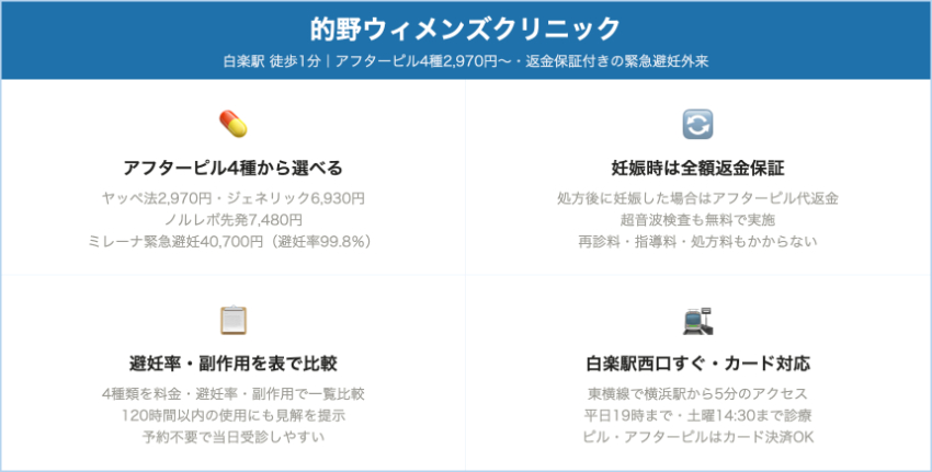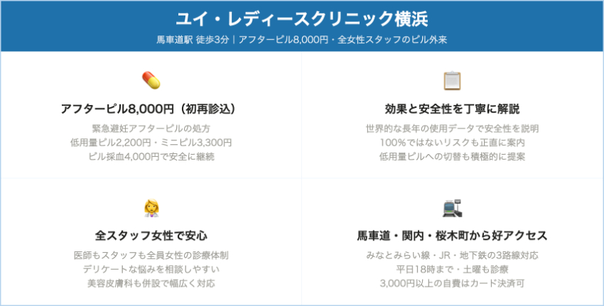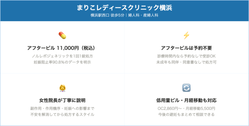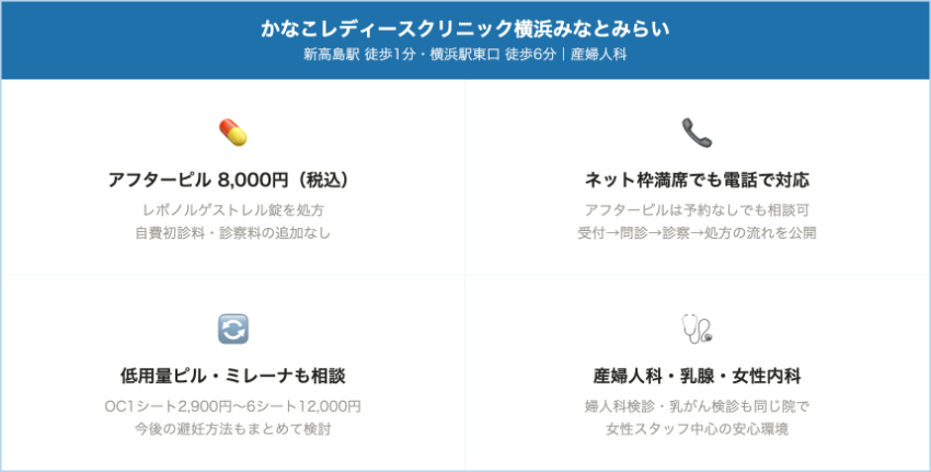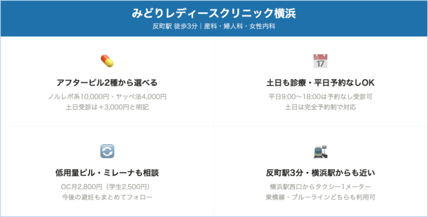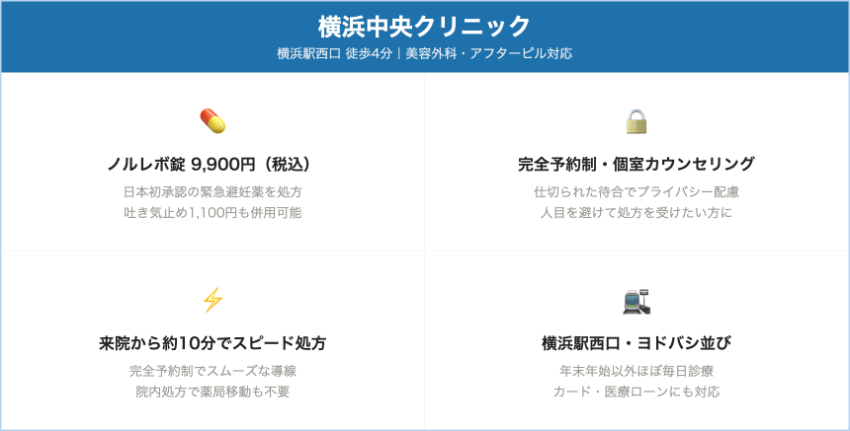 この記事では、横浜駅・桜木町駅・関内駅など主要エリアでアフターピルや緊急避妊薬を自費診療で処方しているレディースクリニックを比較しながら紹介します。