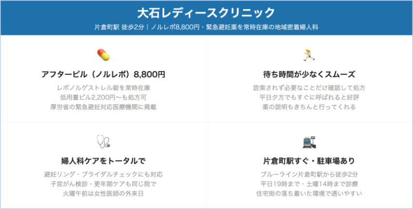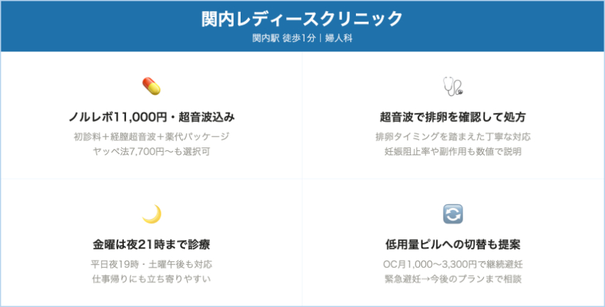 婦人科診療や妊娠相談に加えて、ピル外来として低用量ピル、月経移動、アフターピル緊急避妊法をメニューに掲げていることが公式サイトに明記されています。