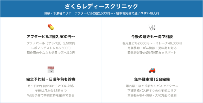 さくらレディースクリニック瀬谷区 下瀬谷/瀬谷駅・桜ヶ丘駅からバス「下瀬谷橋」プラノバール(ヤッペ法)/レボノルゲストレル(72時間)プラノバール:2,500円/レボノルゲストレル:6,500円