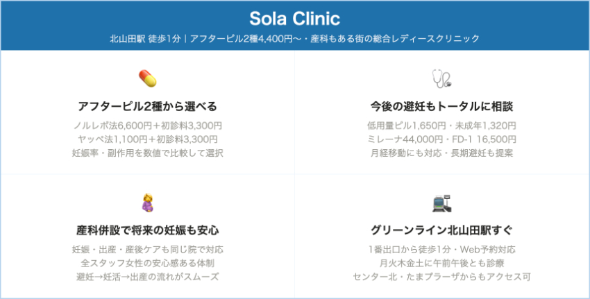 Sola Clinic(ソラクリニック)都筑区 北山田/北山田駅徒歩1分ノルレボ法(72時間)/ヤッペ法ノルレボ法:6,600円+初診料3,300円(実質9,900円)/ヤッペ法:1,100円+初診料3,300円(実質4,400円)