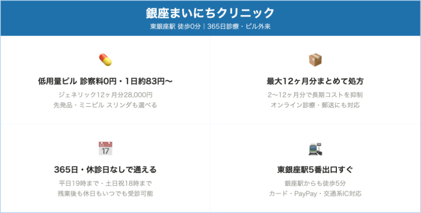 銀座まいにちクリニック東銀座・銀座ジェネリックOC(ファボワール/ラベルフィーユ):実質1か月 2,600円(2か月分5,200円〜)、先発OC(トリキュラー/マーベロン)は実質1か月約2,800円(2か月分5,600円〜)診察料は基本0円(処方不可時のみ診察料2,200円)。オンライン・郵送もOK。平日10:00〜14:30/16:00〜19:00、土日祝9:00〜13:00/14:00〜18:00、休診日なし。