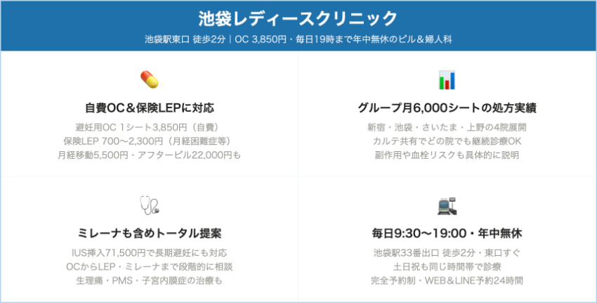 池袋レディースクリニック池袋東口自費OC:1シート 3,850円(税込)月経移動5,500円、アフターピル22,000円。保険LEPは1シート700〜2,300円程度(薬局払い)。キャッシュレス可。毎日9:30〜19:00、年末年始とビル休館日以外は無休。完全予約制(WEB・LINE)。