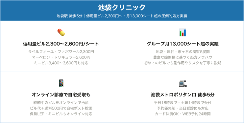 池袋クリニック池袋(池袋駅西口 徒歩約5分)自費低用量ピル:2,300〜2,600円/1シート(税込)診察料は別途(ページに明確額は記載なし)。オンライン診療時もピル代は同額+送料等。月・火・木・金10:00〜18:00、土10:00〜14:00、水日祝休み。