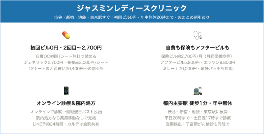 ジャスミンレディースクリニック渋谷・新宿・池袋・東京駅周辺など自費ピル:ラベルフィーユ/ファボワール 2,700円、トリキュラー/マーベロン 3,000円/1シート(税込)(2026年8月以降)初回1シート無料サービス+おまとめ割引あり。ピル定期採血4,000円。診察料はピル代に込みイメージ。クリニックにより異なるが、概ね11:00〜20:00前後+土日祝も診療(年中無休)。