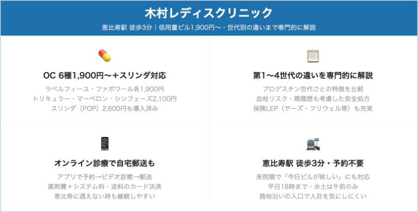 木村レディスクリニック恵比寿自費OC:トリキュラー/マーベロン/シンフェーズ 2,100円、ファボワール/ラベルフィーユ 1,900円/1シート(税込)ピル処方自体は上記薬価(初診・再診は一律扱い)。新アフターピル4,500円(指導料+薬代)。月・火・木・金9:00〜11:00/14:00〜18:00、水・土9:00〜13:00、日祝休み。