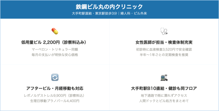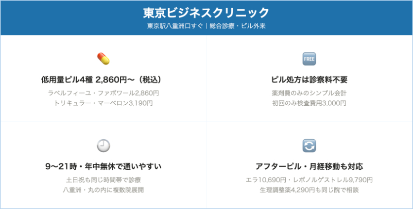 東京ビジネスクリニック(八重洲北口院 等)東京駅八重洲口・丸の内トリキュラー/マーベロン 2,900円(税抜)=3,190円(税込)、ラベルフィーユ/ファボワール 2,600円(税抜)=2,860円(税込)/1シート低用量ピルは薬剤費のみで診察料不要。初回のみ検査費3,300円(税込)。9:00〜21:00、年中無休(院により若干差あり)。