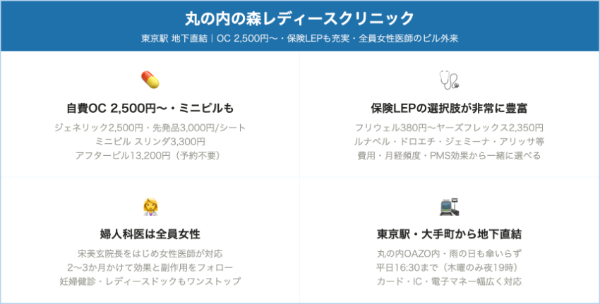 丸の内の森レディースクリニック東京駅丸の内北口自費OC:トリキュラー/マーベロン 3,000円、ラベルフィーユ/ファボワール 2,500円/1シート(税込)別途、診察料・検査料あり(血液検査やエコーなど)。保険LEPはフリウェルLD 440円〜ヤーズフレックス2,350円/1シート(3割負担の薬価目安)。平日中心(9:00〜13:00/14:00〜16:30など、木曜のみ夜診あり)、土日祝休み。