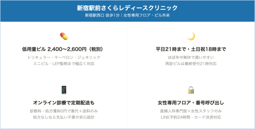 新宿駅前さくらレディースクリニック新宿(新宿駅西口すぐ)院内処方ピル:2,400〜2,600円/1シート(税別)=税込約2,640〜2,860円自費初診1,500円・再診500円(税別)。オンラインピルはラベルフィーユ/ファボワール2,350円、マーベロン/トリキュラー/アンジュ2,540円(税込)。平日11:00〜15:00/17:00〜21:00、土日祝10:00〜14:00/15:00〜18:00。ほぼ無休。