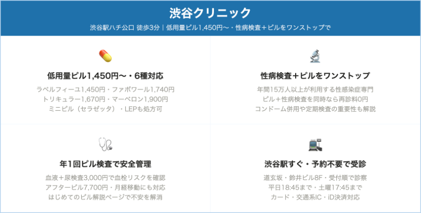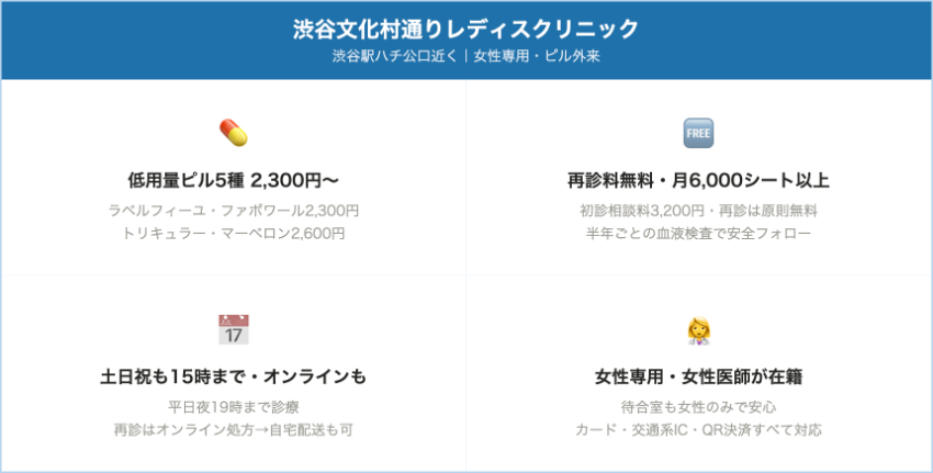 渋谷文化村通りレディスクリニック渋谷(渋谷駅ハチ公口 徒歩数分)2,300〜2,600円/1シート(税込)(ラベルフィーユ・ファボワール等)初診相談料3,200円(税込)、再診料は原則無料(検査時は別途)。半年ごとに血液検査推奨。平日10:00〜12:30/15:00〜19:00、土日祝〜15:00。火・金休み。