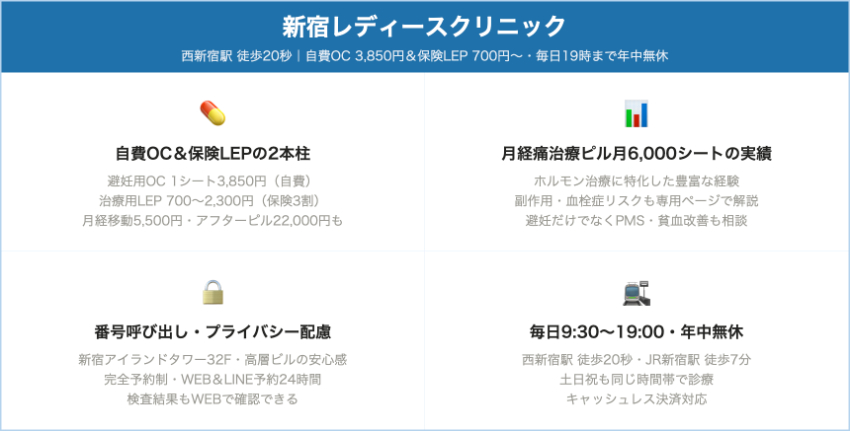 新宿レディースクリニック西新宿(西新宿駅直結)自費OC:1シート 3,850円(税込)(グループのオンライン継続処方価格より)自費アフターピル22,000円、月経移動5,500円など。保険LEPは1シート700〜2,300円程度+診察・検査料。毎日9:30〜19:00、年末年始とビル休館日以外は無休。