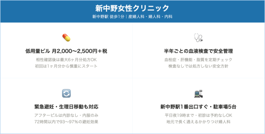 新中野女性クリニック新中野自費OC:1か月 2,000〜2,500円+税(ピル代のみ)初診・2回目・半年ごとに血液検査(各5,000円+税程度)。処方料は不要で「基本は薬代+必要な検査料」という料金体系。月・火・木・金10:00〜12:30/15:00〜19:00、土午前のみ、水・日祝休み。