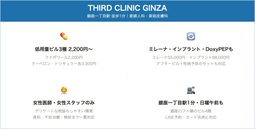 THIRD CLINIC GINZA銀座一丁目・銀座自費OC:ファボワール 2,200円、マーベロン/トリキュラー 各3,300円/1シート(税込)自費診療は別途 初診料3,850円・再診料1,650円。ミレーナ・インプラント・アフターピル等も明確料金。月金10:00〜13:00/14:30〜19:00、他曜日は午前または午後のみ・水祝休み・日曜午前のみ診療。