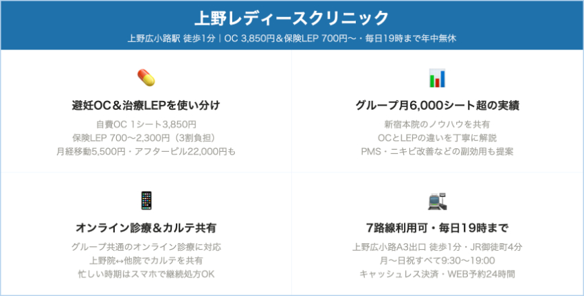 上野レディースクリニック上野・御徒町自費OC:1シート 3,850円(税込)アフターピル22,000円、月経移動5,500円。保険LEPは1シート700〜2,300円程度+診察・検査料。毎日9:30〜19:00、休診日は年末年始とビル休館日のみ。