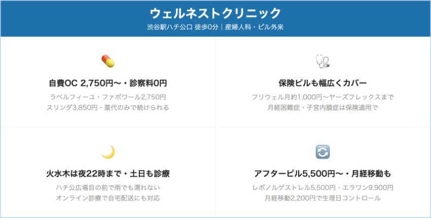 ウェルネストクリニック(渋谷院)渋谷(ハチ公口0分)自費ピル:ラベルフィーユ/ファボワール 2,750円、アンジュ2,970円、スリンダ3,850円/1か月分(税込)自費低用量ピルは「診察料0円」で薬代のみ。保険ピルは1か月約1,000〜2,900円+初診約1,000円/再診約600円(3割負担)。平日〜22:00の日あり、土日も〜19:00と遅い時間帯まで診療(曜日で変動)。
