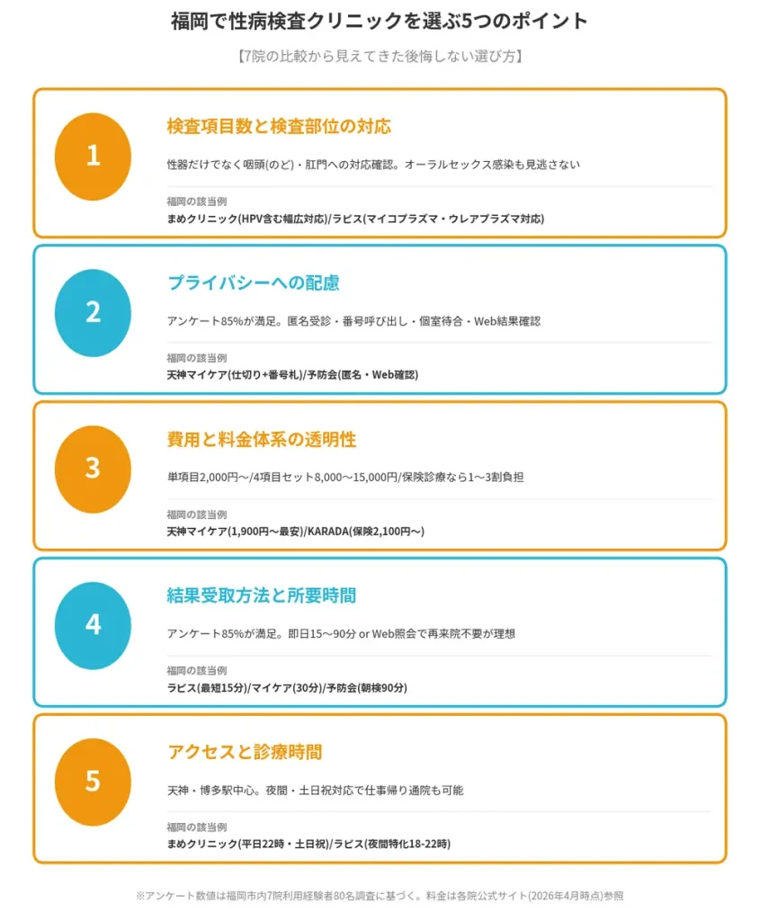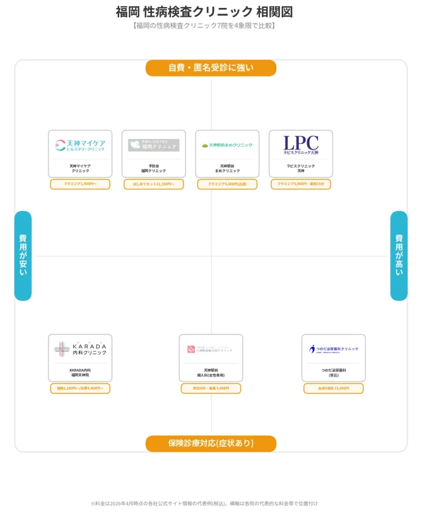 費用を重視するなら天神マイケアクリニック(クラミジア1,900円〜)、夜間・休日を優先するならラピスクリニック天神や天神駅前まめクリニック、保険診療を希望するならKARADA内科クリニックや天神駅前婦人科クリニックが選択肢となります。