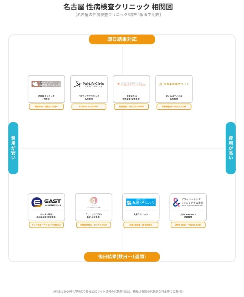 以下の表は、名古屋市内で性病検査を提供する全クリニックを主要な比較軸でまとめたものです。