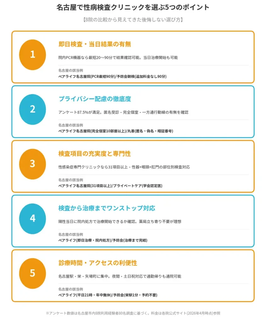 この記事では、名古屋エリアの性病検査クリニックを費用・アクセス・検査項目の観点から詳しく比較・紹介します。