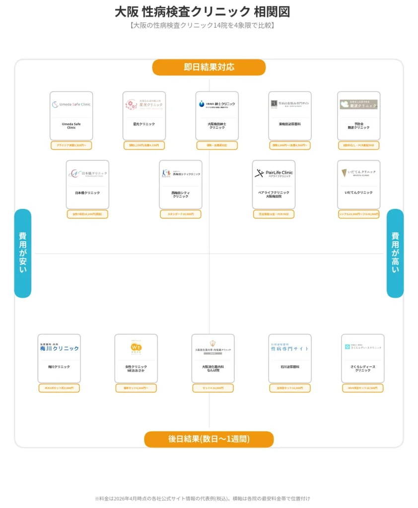 即日結果を重視するなら梅田エリアの専門クリニック、費用を抑えたいなら梅川クリニックの約3,000円や星光クリニックの保険診療1,230円が際立ちます。