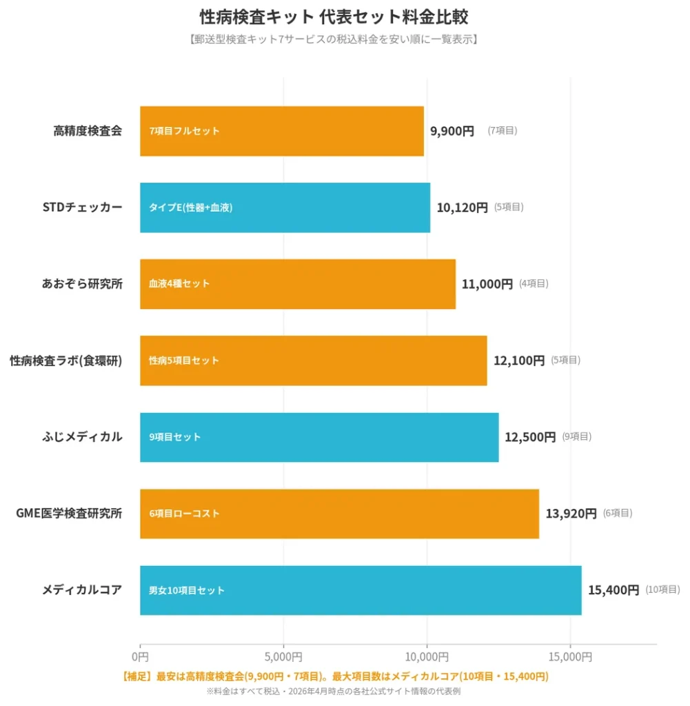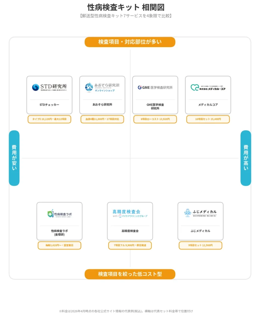 性病検査キットを選ぶ際に特に重視したい4項目を一覧で比較しました。各サービスの料金は代表的なセットの税込価格を掲載しています。