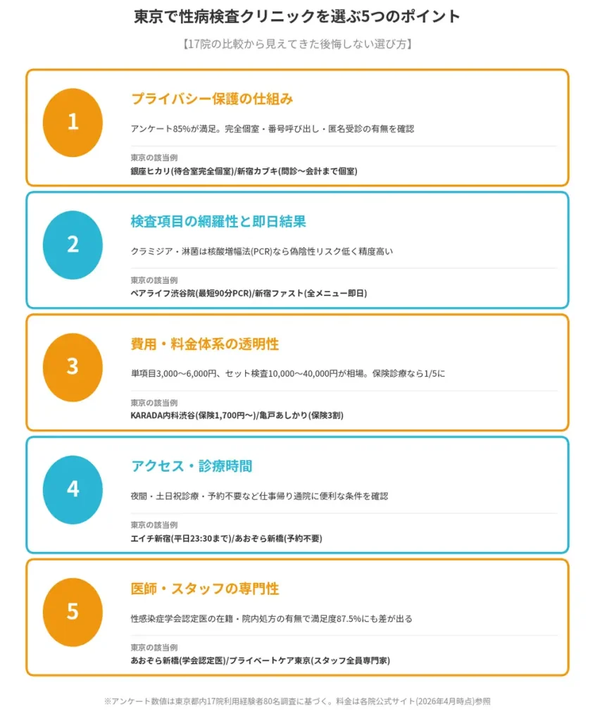 また「結果を今日中に知りたいか」「費用を抑えたいか」「匿名で受診したいか」「土日に受診したいか」という優先事項も整理しておくと、クリニック選びがスムーズになります。
