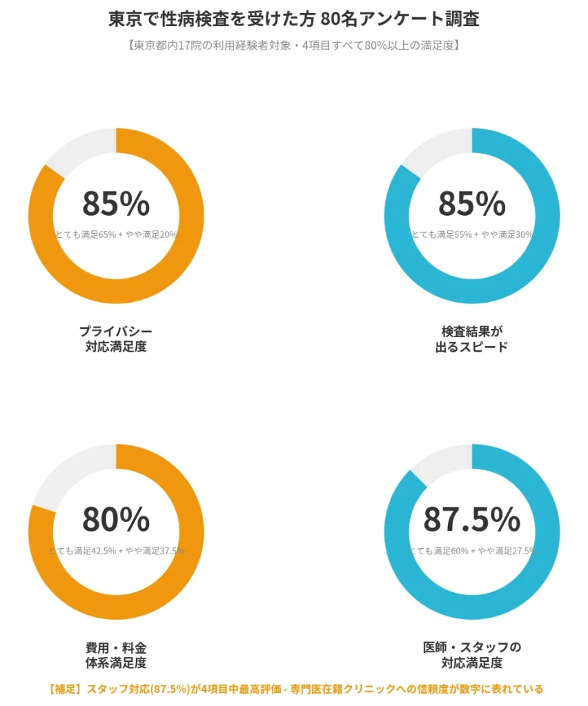 - 実際に受診した80名のアンケートをもとにした、プライバシー・費用・スタッフ対応の満足度データ