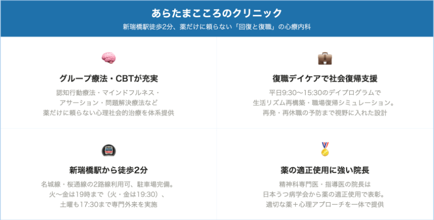 あらたまこころのクリニック|新瑞橋駅徒歩2分、薬だけに頼らない「回復と復職」の心療内科