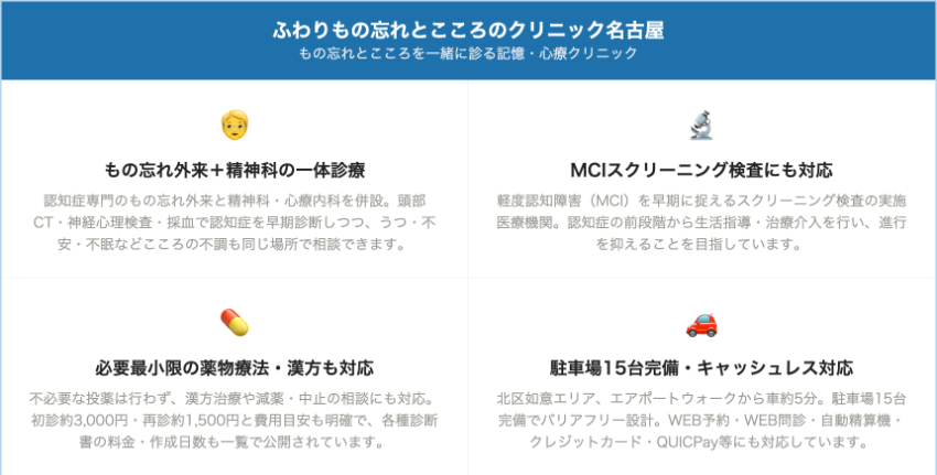 | ふわりもの忘れとこころのクリニック名古屋 | 北区如意(味美駅徒歩15分・P15台) | 精神科・心療内科+もの忘れ外来・老年内科を併設 | 初診:約3,000円/再診:約1,500円(保険3割)/一般診断書(当院書式):2,500円/自立支援診断書:3,800円/障害年金診断書:13,000円 など |