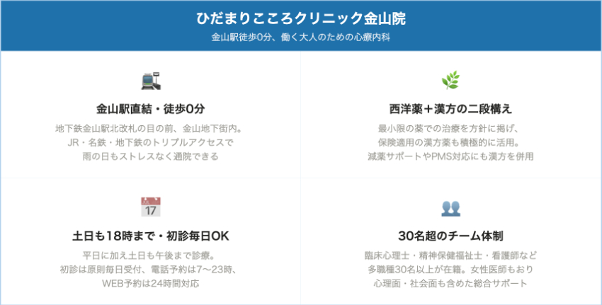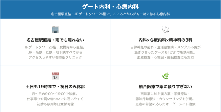 名古屋駅前という立地と、平日19:30まで+土曜診療という診療時間を活かして、仕事帰りや休日にも通いやすい働く世代のメンタルクリニックとしての役割も大きいクリニックです。