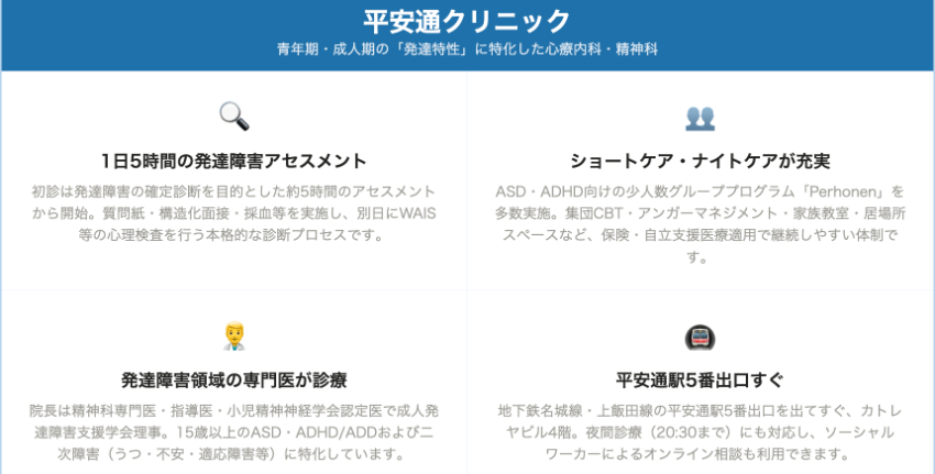 | 平安通クリニック | 平安通駅5番出口すぐ | 青年期・成人期の発達障害専門/ショートケア・ナイトケア充実 | 発達障害確定診断初診予約料:6,600円(診察は別途保険)/ガイダンス1時間:4,400円(平日昼)/ソーシャルワーカー相談20分:0円〜、45分:3,300円/各種診断書:自立支援4,000円・手帳7,500円・障害年金初回15,100円など |