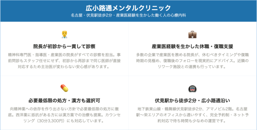 | 広小路通メンタルクリニック | 伏見駅徒歩2分 | 産業医経験豊富な院長が一貫診療/完全予約制 | 初診:保険診療約2,300円+予約料5,500円(合計7,000円台)/再診:約1,500円/カウンセリング30分:3,300円 |