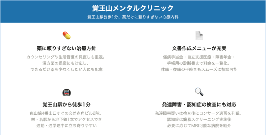 | 覚王山メンタルクリニック | 覚王山駅4番出口徒歩1分 | 駅チカ/「薬に頼りすぎない」治療/各種文書が豊富 | 初診:2,800円〜(発達障害疑いは検査込みで4,000円〜)/再診:1,300円〜(保険3割)/予約診療(選定療養費):5,500円/診断書(当院書式):3,300円 |