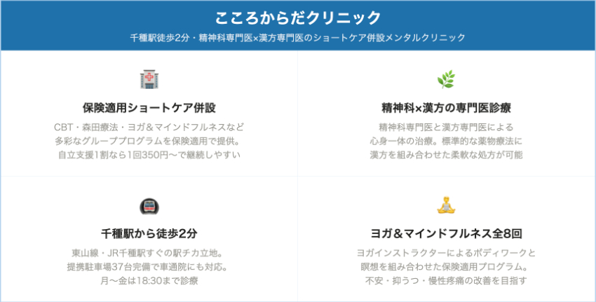 | こころからだクリニック | 千種駅徒歩2分 | 精神科専門医×漢方専門医/保険ショートケア併設 | 初診:約2,500円(保険3割・成人)/再診:約1,500円/ショートケア1回:自立支援1割350〜370円・3割1,050〜1,120円程度/発達プログラム:1割約570円〜・3割約1,710円〜 |